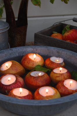 水をはったバケツにリンゴを浮かし、暮れゆく秋を楽しみます。